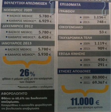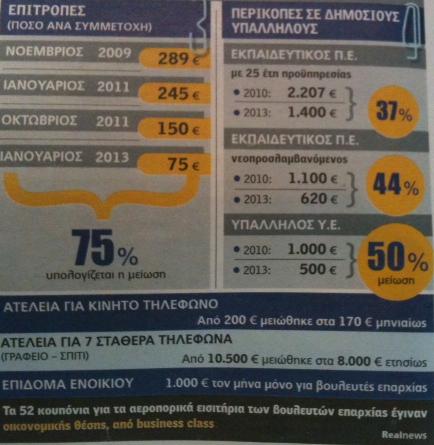Οι μειώσεις στα επιδόματα έχουν γίνει σταδιακά. Το 2009 οι βουλευτές έπαιρναν για επίδομα οργάνωσης γραφείου 1.156 ευρώ, το 2011 μειώθηκε στα 935 ευρώ και τον Ιανουάριο του 2013 κατέληξε στα 748 ευρώ. Τα ταχυδρομικά τέλη, από 1.119 ευρώ το 2009 μειώθηκαν στα 909 ευρώ στο 2013. Τα έξοδα κίνησης για τους βουλευτές Λεκανοπεδίου, από 450 ευρώ μειώθηκαν στα 291 ευρώ.